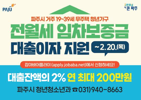 파주시는 2월 20일까지 ’청년 전월세 임차보증금 대출이자 지원사업‘의 대상자를 모집한다.