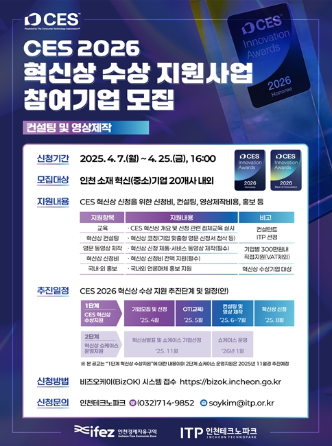 인천경제자유구역청은 ‘CES 2026 혁신상 수상지원사업’에 참여할 혁신 기업을 오는 25일까지 모집한다고 밝혔다.