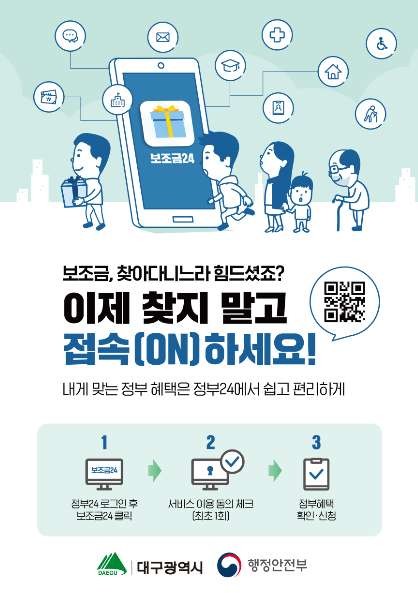 시범운영 지역으로 선정된 동구, 서구, 수성구, 달서구, 달성군의 주민이면 누구나 ‘정부24’에 접속해 지원받을 수 있는 보조금 정보를 한 번에 확인 가능하다.