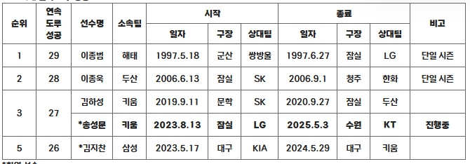 | ▲ 역대 연속 도루 성공 TOP5 |