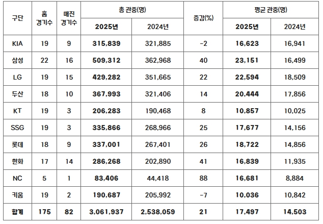 | ▲ 025년 구단별 관중 현황(2024-2025 홈 경기수 비교) |