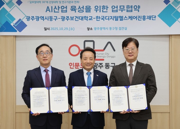 광주 동구는 지난 29일 구청 접견실에서 광주보건대학교(총장 김경태), 한국디지털헬스케어진흥재단(원장 박기원)과 인공지능(AI) 헬스케어 산업 육성, 인구 감소 해결, 원도심 활성화를 위한 업무협약을 체결했다고 밝혔다.