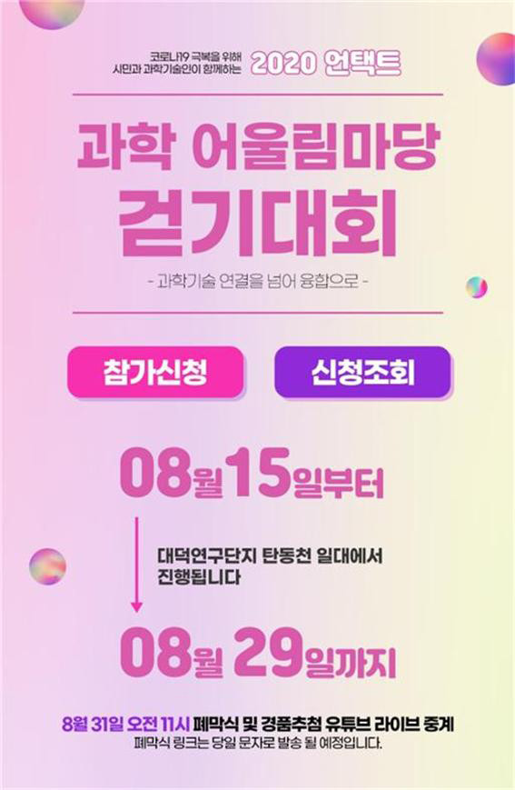 참가 신청은 ‘2020 과학 어울림마당 걷기대회’ 홈페이지에서 할 수 있으며 연구단지 운동장 국기게양대에서 출발하면 된다.