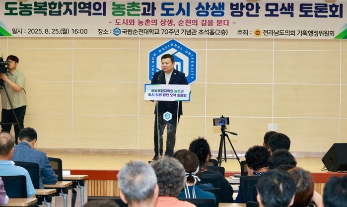 전라남도의회 정영균 의원(더불어민주당, 순천1)이 지난 8월 25일, 순천대학교 70주년 기념관 초석홀에서 '도농복합지역의 농촌과 도시상생 방안 모색 토론회'를 개최했다.
