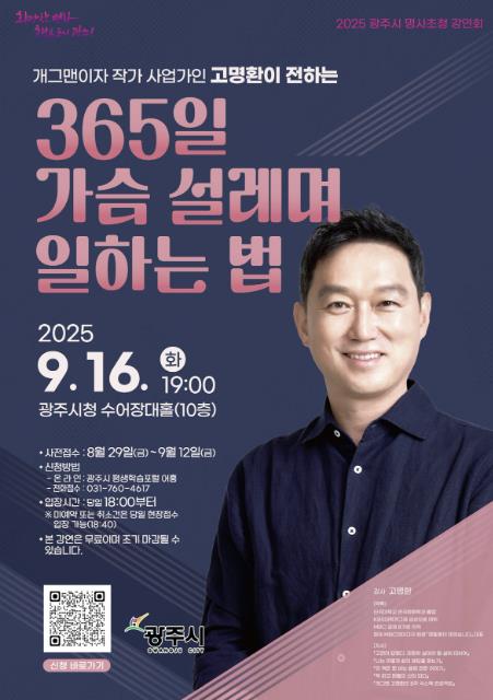 이번 강연에는 20년 이상의 방송 경력을 쌓고 현재는 작가로 활동 중인 고명환 강사가 초청돼 ‘365일 가슴 설레며 일하는 법’을 주제로 시민들과 만난다. 고 강사는 저서 ‘고전이 답했다, 마땅히 살아야 할 삶에 대하여’로 2024년 교보문고 올해의 작가상을 수상한 인물로 삶에 대한 성찰과 긍정적인 태도를 강연에 담아낼 예정이다.