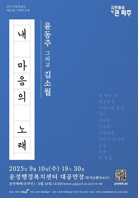 파주시는 오는 9월 10일 오후 7시 30분, 운정행복센터 대공연장에서 시립예술단 제83회 기획연주회 ’내 마음의 노래 '윤동주 그리고 김소월'‘를 개최한다고 밝혔다.