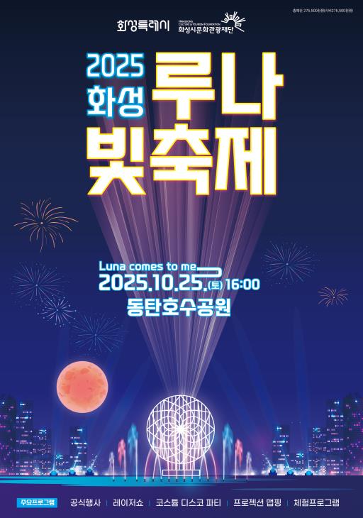(재)화성시문화관광재단은 화성시 대표 명소인 동탄호수공원과 루나쇼를 연계한 '2025 화성 루나 빛 축제'를 오는 10월 25일 토요일 16시에 개최한다.