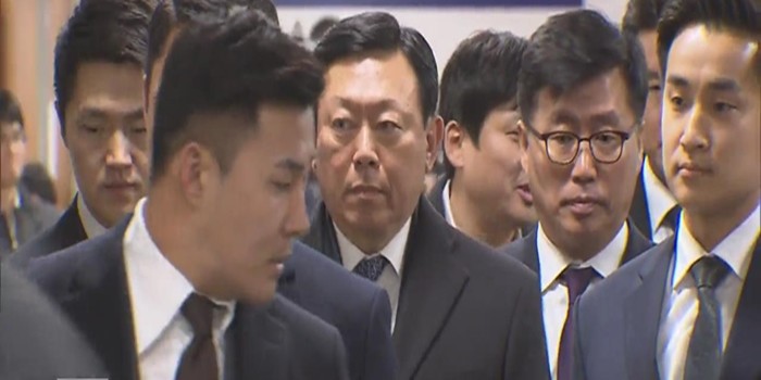 ▲지난 2월 재판을 받기 위해 법정에 출석하고 있는 신동빈 롯데그룹 회장, 이날 신 회장은 징역형을 선고 받고 법정구속 됐다. <사진=KBS뉴스 갈무리> |