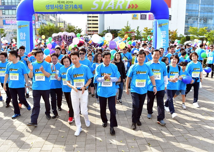 윤화섭 안산시장이 지난 6일 안산문화광장에서 열린 2019 생명사랑 걷기축제에서 축사를 하고 있다. 축제는 내·외빈을 비롯해 지역주민 등 1만여 명이 참가한 가운데 2㎞ 구간을 함께 걷는 행사가 마련됐다.