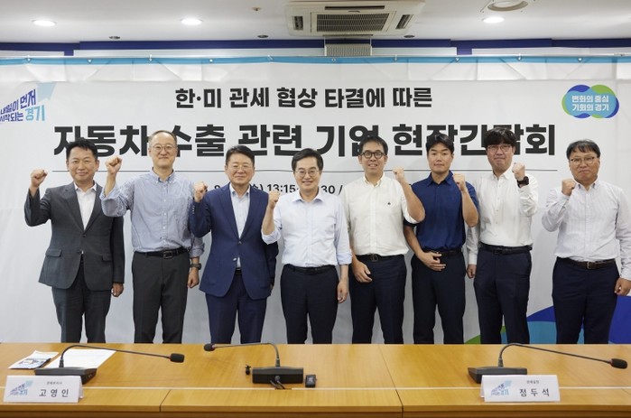 ▲ 지난 20일 오후 평택항마린센터에서 열린 자동차 수출기업 관계자 현장간담회에서 김동연 경기도지사와 현대차 등 자동차 업계 관계자들과 함께 간담회 후 기념촬영을 하고 있다. |