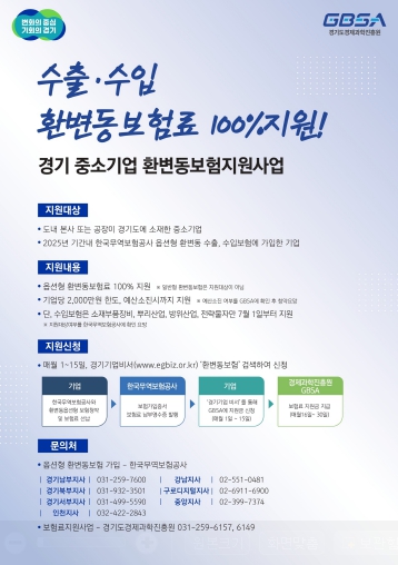 신청은 경기기업비서에서 ‘환변동보험 지원사업’을 검색해 온라인으로 진행할 수 있으며, 관련 문의는 경기도경제과학진흥원 수출마케팅팀(031-259-6149)으로 하면 된다. 수출입 관련 기업애로가 있는 경우 기업애로원스톱종합지원센터(1533-1472)를 통해 상담도 가능하다.