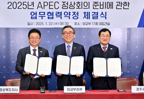 경상북도와 외교부, 경주시는 원활히 진행되는 APEC 준비 상황을 점검하고, 향후 더 체계적이고 신속한 업무 추진을 위해 3자 간 ‘2025년 APEC 정상회의 업무협력 MOU’를 체결했다.