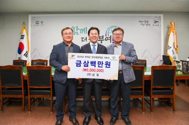 ㈜삼일은 지난 1일 부여군청을 방문하여 인재 육성을 위한 장학금 3백만 원을 (재)부여군굿뜨래장학회(이사장 박정현)에 기탁했다.