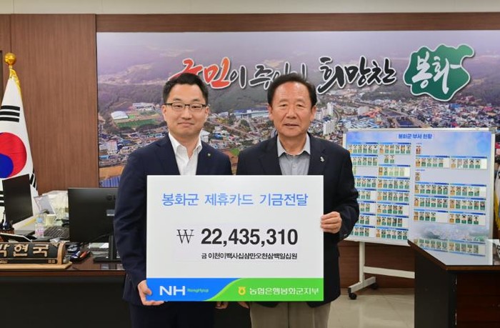 봉화군은 지난 26일 NH농협은행 봉화군지부 등 관계자 4명이 봉화군청 군수실에서 2024년도 제휴카드 적립기금 2,200만 원을 전달했다고 밝혔다.