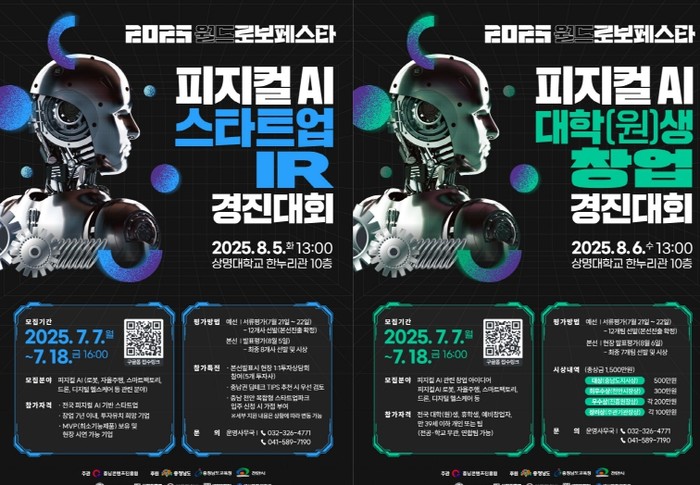 충남콘텐츠진흥원은 오는 8월 5일 천안(상명대학교)에서 개최되는 ‘2025 월드 로보 페스타’의 주요 프로그램으로『피지컬AI 스타트업 IR 경진대회』와 『피지컬AI 대학(원)생 창업 경진대회』를 동시 개최하며 이에 참여할 참가팀을 모집한다고 밝혔다.