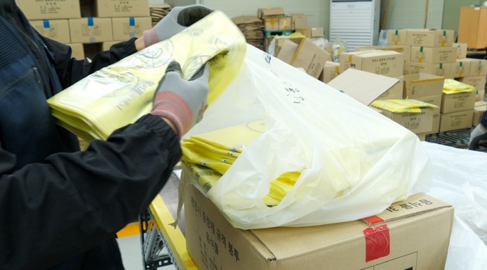 | ▲ 1. 천안 종량제판매소에서 도시공사 직원이 종량제봉투를 포장하고 있다. |