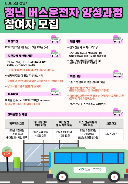 천안시는 지난해 청년 버스 운전자 양성 프로그램에 참여한 청년 8명을 지역 운수회사에 취업 연계했으며, 올해는 사업을 확대 운영해 상반기(3 부터 6월) 10명, 하반기(7월 부터 9월) 10명 총 20명의 청년 버스 운전자를 양성할 계획이다.