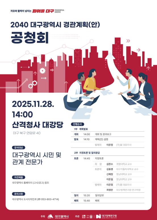 대구광역시는 11월 28일 오후 2시 산격청사 대강당에서 ‘2040 대구광역시 경관계획(안)’에 대한 공청회를 열고, 시민과 전문가의 폭넓은 의견을 수렴한다.