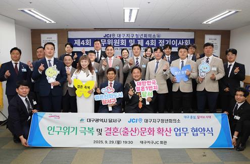 대구 달서구는 지난 29일 대구지구청년회의소(회장 이성범)와 초저출생 인구 위기 극복 및 긍정적 결혼문화 확산을 위한 업무협약을 체결했다.