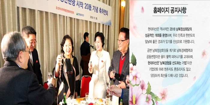 ▲지난 18일 금강산관광 시작 20주년 기념 남북공동행사 후 금강산호텔에서 열린 축하연회에서 현정은 현대그룹 회장(가운데)이 박지원 민주평화당 의원(오른쪽) 등 남북 참석자들과 건배하는 모습(왼쪽)과 현대아산 홈페이지(오른쪽). <사진=현대그룹 제공> |