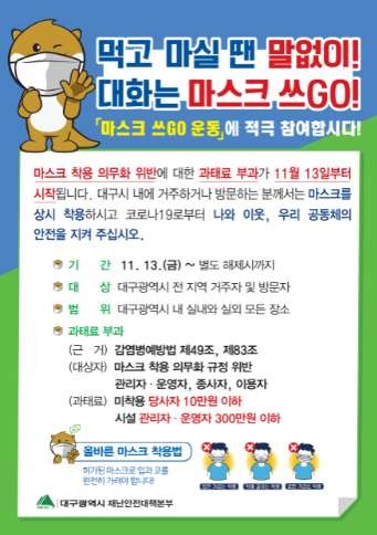 또한, 대구시는 수도권 단계 격상 이전인 11월 13일부터 “먹고 마실 땐 말없이, 대화할 땐 마스크 쓰고” 하자는 ‘마스크 쓰GO’ 운동을 시민대표 200여명으로 구성된 ‘코로나19 극복 대구광역시 범시민대책위원회’와 함께 시민문화운동으로 전개하고 있다.