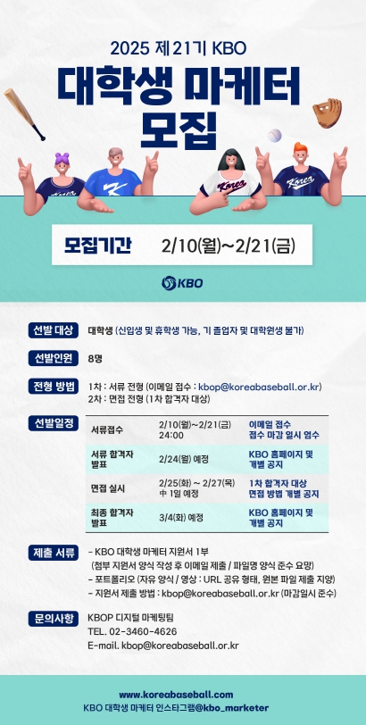 KBO가 2월 10일(월)부터 2025 제 21기 KBO 대학생 마케터를 모집한다.