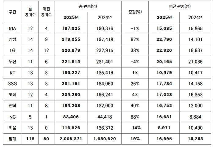 | ▲ 2025년 구단별 관중 현황(2024-2025 홈 경기수 비교) – 4.22(화) 기준 |