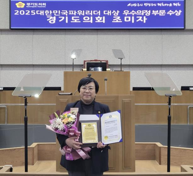 경기도의회 문화체육관광위원회 조미자 부위원장(더불어민주당, 남양주3)은 7일 한국프레스센터에서 열린 ‘2025 대한민국파워리더대상’ 시상식에서 도민을 위한 헌신적인 의정활동과 실질적인 정책 대안 제시를 통해 지방자치 발전에 기여한 공로를 인정받아 우수의정 부문 대상을 수상했다.
