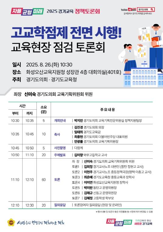 한편, 토론회는 경기도의회와 경기도교육청이 공동으로 주최하며 누구나 사전 신청없이 현장 참석 또는 유튜브 생중계를 통해 참여가능하다.