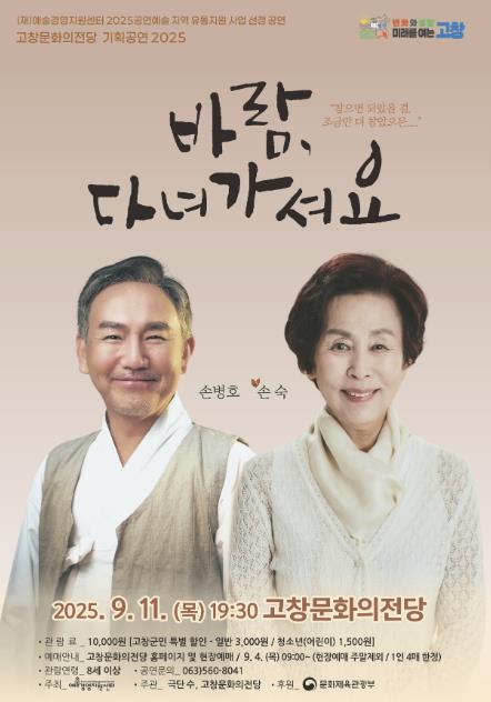 고창문화의전당이 손숙·손병호 주연의 연극 ‘바람, 다녀가셔요’ 공연을 오는 11일 저녁 7시30분에 무대에 올린다.