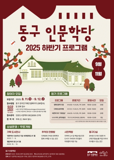 광주 동구는 오는 9월 12일까지 동구 인문학당의 ‘2025 하반기 프로그램’에 참여할 주민을 모집한다고 밝혔다.