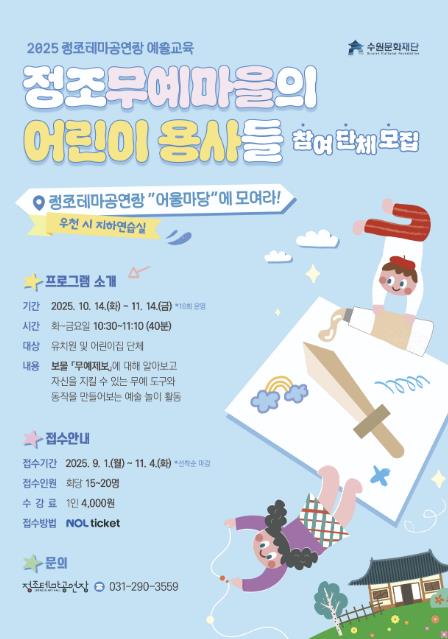 수원문화재단은 오는 10월 14일부터 11월 14일까지 정조테마공연장 어울마당에서 ‘2025 정조테마공연장 예술교육 '정조무예마을의 어린이 용사들'’을 진행한다.