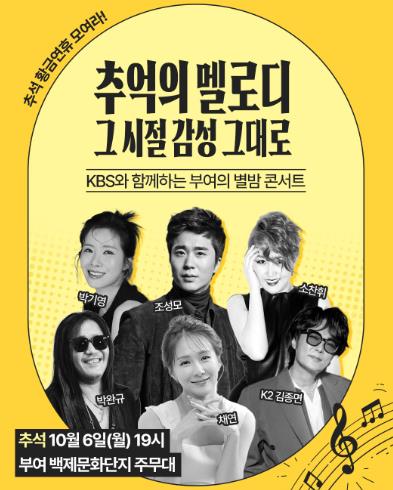 부여군은 오는 10월 6일 추석 당일 저녁 7시, 백제문화단지 주무대에서 KBS와 함께하는 특별 기획 공연 '부여의 별밤 콘서트'를 개최한다고 밝혔다.