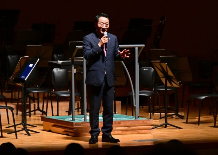 | ▲ 유정복 인천광역시장이 15일 아트센터인천에서 열린 '제61회 인천시민의날 기념음악회'에서 인사말을 하고 있다. |