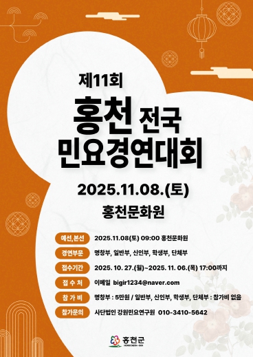 홍천군은 11월 8일 홍천문화원에서 ‘제11회 전국민요경창대회’를 개최한다고 밝혔다.