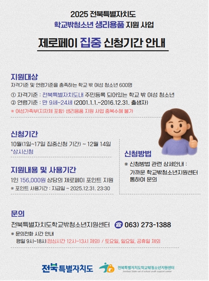 전북특별자치도가 경제적 부담을 겪는 학교 밖 여성청소년들을 대상으로 생리용품을 지원하는‘2025년 학교 밖 여성청소년 건강지원사업’을 추진한다.