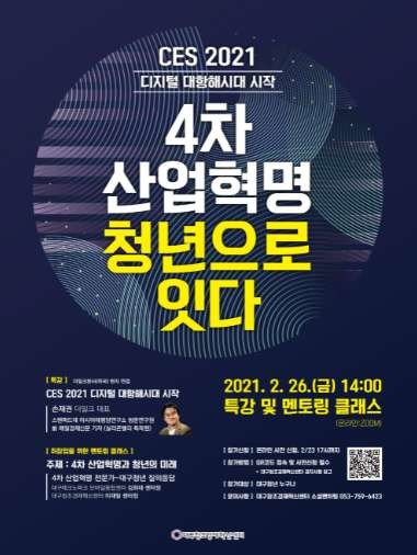 손재권 더밀크(The Miilk)* 대표의 ‘CES 2021, 디지털 대항해시대 시작’ 특강 및 4차 산업혁명 전문 멘토단(이재일 대구창조경제혁신센터장, 김희대 대구테크노파크 모바일융합센터장)과 함께하는 취·창업 멘토링 클래스로 구성되는 본 행사는 온라인(ZOOM)으로 약 90분간 진행된다.