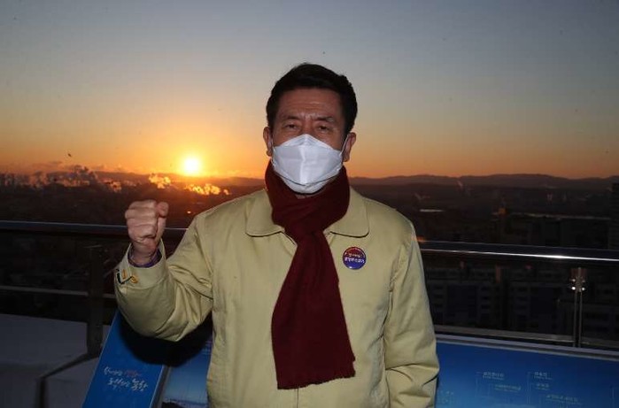 ▲ 지난 1월 1일 아침, 이강덕 포항시장이 포항시청 햇살마루(옥상, 16층)에서 신축년 새해를 맞아 힘찬 결의를 다지고 있다.