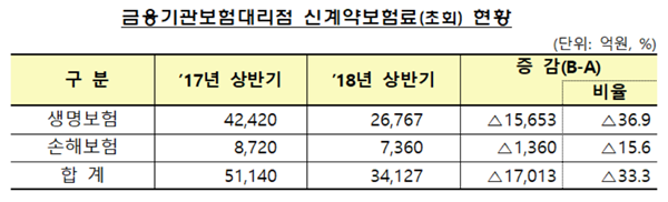 금융감독원이 12일 발표한 `2018년 상반기 금융기관 보험대리점 영업실적`에 따르면 상반기 금융기관 보험대리점의 신계약 초회보험료는 생명보험 2조6767억원, 손해보험 7360억원이다. 전년 동기 대비 각각 36.9%, 15.6% 감소했다.