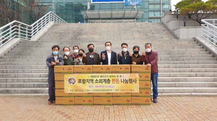(사)대한한돈협회 포항지부는 18일 관내 무료급식소 및 사회복지시설에 전달해 달라며 한돈 400kg(300만원 상당)을 포항시에 기탁했다.