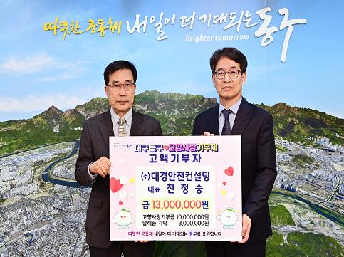 주인공은 전정숭 대경안전컨설팅(주) 대표로, 지난 28일, 대구 동구청에 고향사랑기부금 1천만원을 기탁했다.