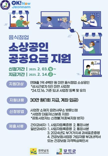 강진군이 이달 3일부터 28일까지 ‘음식점업 소상공인 공공요금 등 지원사업’을 추진한다.