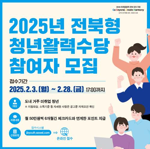 정읍시가 미취업 청년의 구직활동을 지원하기 위해 전북형 청년활력수당 지원사업 참여자를 2월 3일부터 28일까지 모집한다.