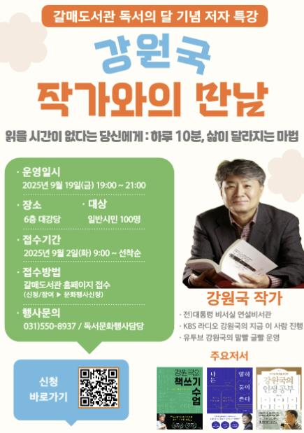 구리시 갈매도서관은 독서의 달을 기념하여 시민들에게 책과 더욱 가까워질 수 있는 기회를 제공하고자 9월 19일 금요일 베스트셀러 작가 강원국을 초청해 작가와의 만남을 운영한다.