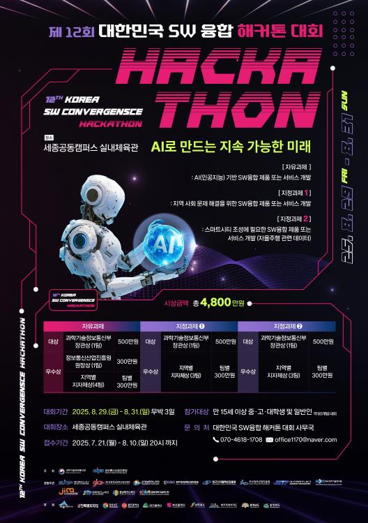 세종테크노파크는 과학기술정보통신부와 정보통신산업진흥원(NIPA)이 주최하고, 세종테크노파크를 포함한 전국 12개 지역SW산업진흥기관이 공동 주관하는 '제12회 대한민국 SW융합 해커톤 대회'가 오는 8월 29일(금)부터 31일(일)까지 무박 3일간, 세종공동캠퍼스 실내체육관에서 개최된다고 밝혔다.