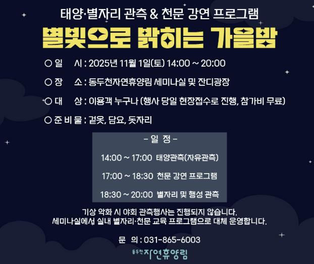 동두천시시설관리공단은 오는 11월 1일 동두천자연휴양림에서 가을밤 하늘을 배경으로 별자리와 행성을 함께 관측하는 '천문행사 ‘별빛으로 밝히는 가을밤’'을 개최한다.