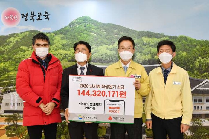 경북교육청(교육감 임종식)은 지난 7일 접견실에서 ‘2020 난치병 학생 돕기 성금 전달식’을 갖고, 올해 모금액인 1억4400여만원을 경북사회복지공동모금회에 전달했다.