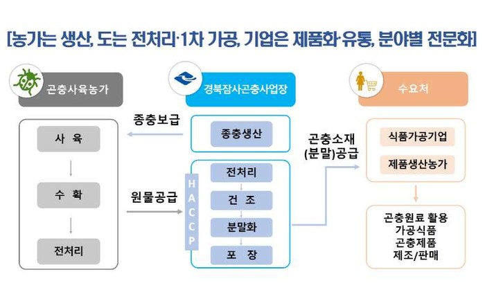 또한, 기준의 농가가 생산-가공-유통을 전담하는 농가 중심적 산업구조에서 농가는 생산, 도는 전처리.1차 가공, 기업은 제품화.유통을 전담하는 분야별 전문화된 산업구조 체계화해 곤충산업의 구조적 혁신을 도모하겠다는 방침이다.