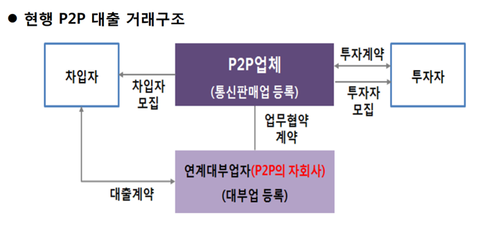 차입자와 투자자를 중개하는 P2P 대출 업체에 대해선 현재 법적 효력이 없는 가이드라인과 대부업 자회사에 대한 간접 규제만 적용될 뿐, 금융당국이 직접 감독하고 있지 않다. 이에 금융당국은 국회에 제출된 5개 P2P 대출 관련 법안을 바탕으로 올해 1분기 중 P2P 대출 관련 입법을 마무리할 계획이다.