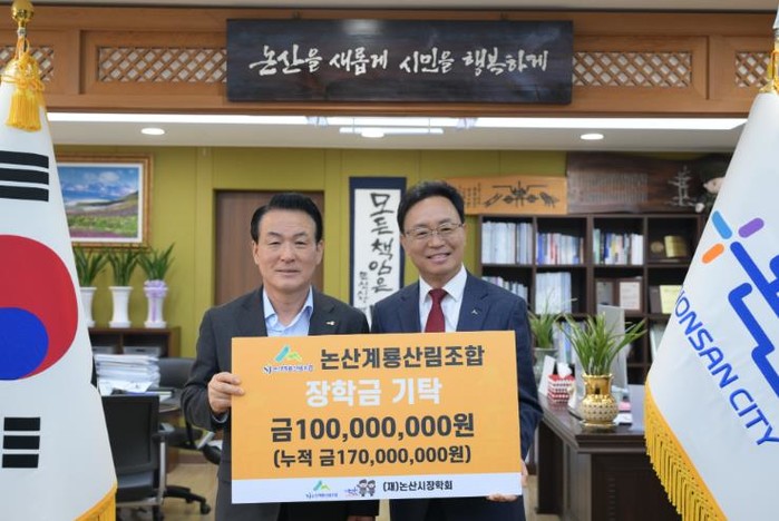 논산계룡산림조합에서 25일 관내 미래인재 육성을 위해 (재)논산시장학회에 장학금을 기탁하며 따뜻한 나눔을 실천했다.